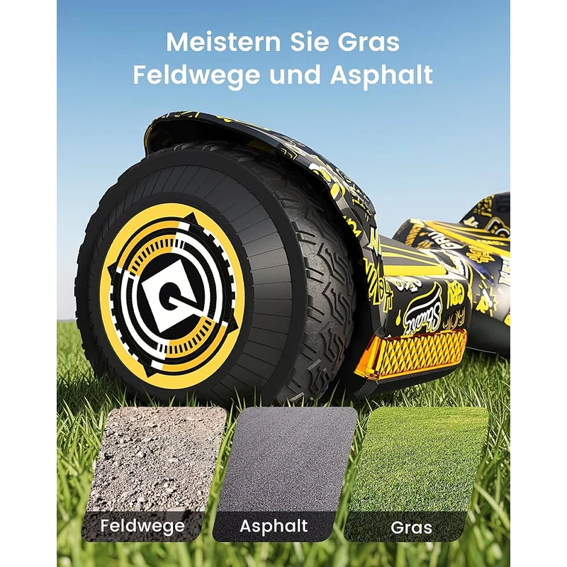 A terepjáró gumiabroncsoknak köszönhetően a deszka jól kezeli a könnyű ösvényeket, a kavicsot vagy a füvet – de nem igazi terepjáró kalandokra tervezték nagyon egyenetlen terepen.